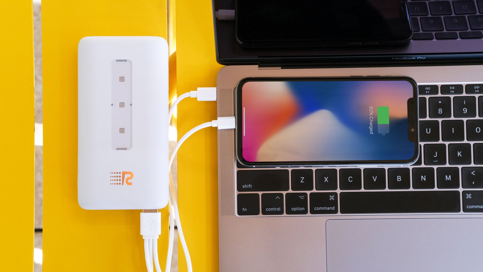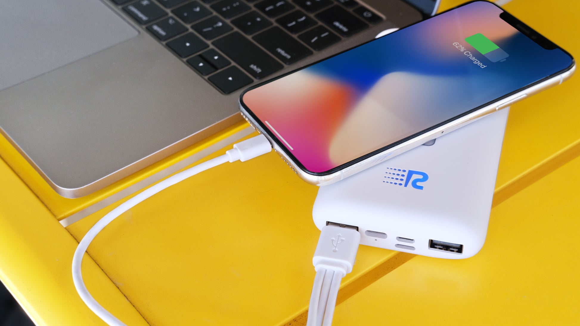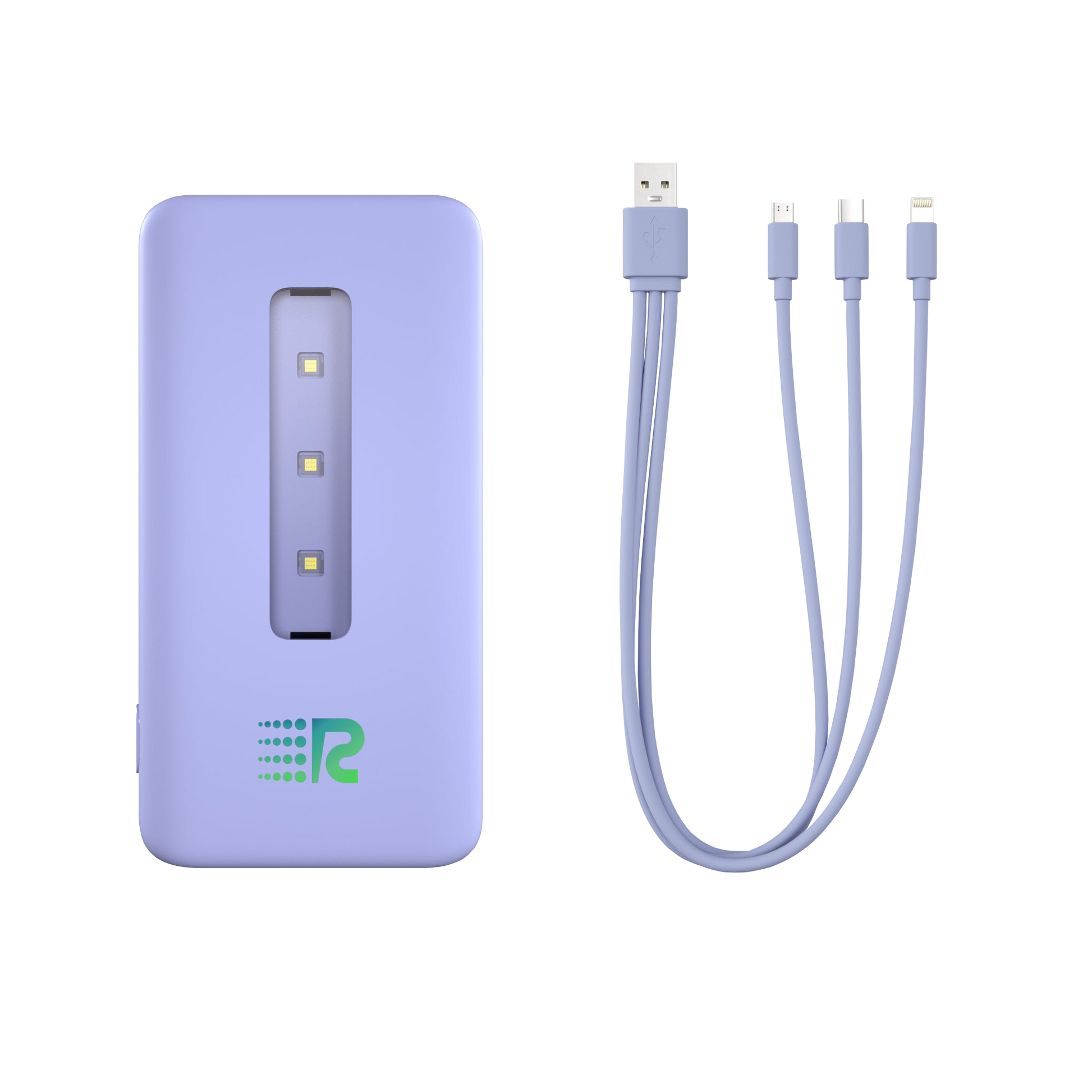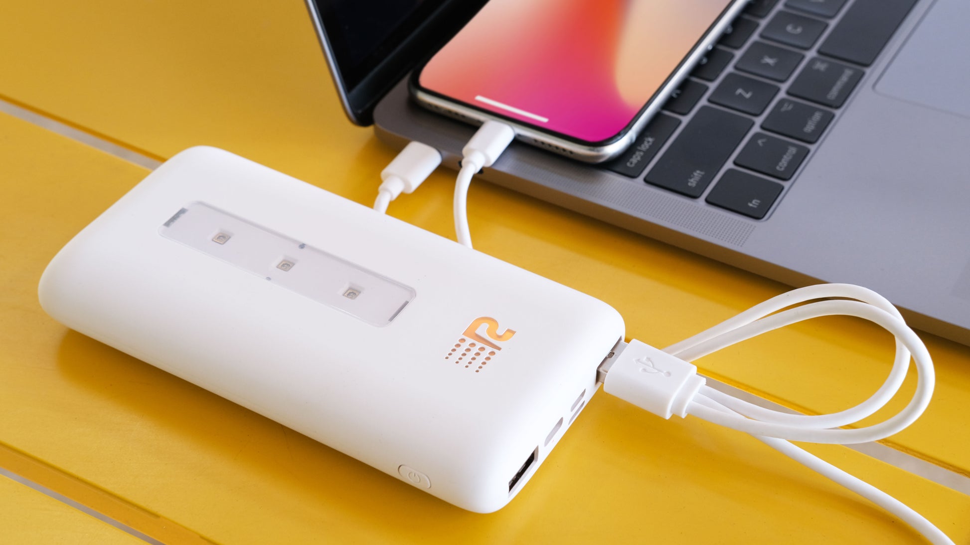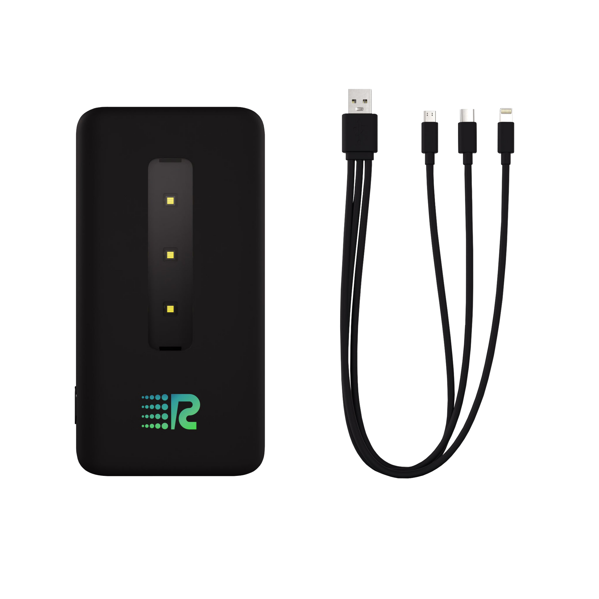 With two USB outputs to plug in 2 3-in-1 cables (USB-C, Micro-USB, and Apple Lightning) and magnetic wireless charging, the Rush Bank UVC lets you charge up to 7 devices at once. One 3-in-1 cable is included in the box. Stay powered, no matter how many devices you carry!